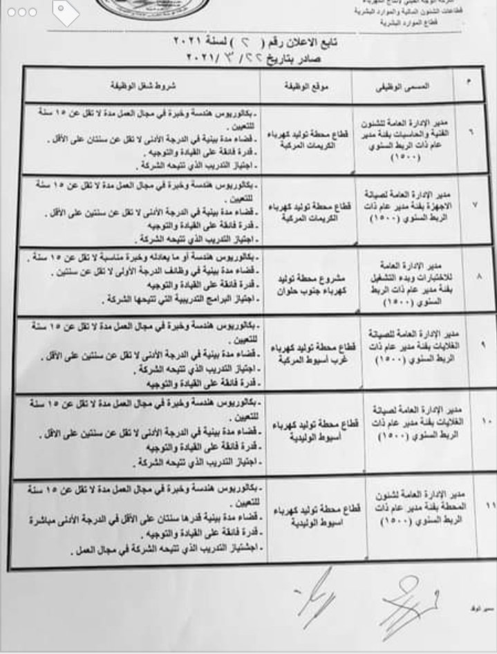 تعلن شركة الوجه القبلي لانتاج الكهرباء عن حاجتها للوظائف التالية وفقا للإعلان رقم (2) لسنة 2021 الصادر بتاريخ 2021/3/22:-