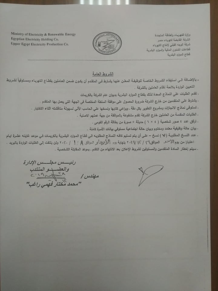 اعلان وظائف قيادية بشركة الوجه القبلي لانتاج الكهرباء...........